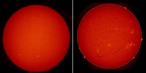 Фотографии позволяют наглядно увидеть, насколько значительной является разница не только в уровне активности, а даже просто во внешнем виде Солнца на разных стадиях солнечного цикла: в данном случае в самом начале текущего 25-го цикла активности (2020-й год) и сейчас, недалеко от его максимума.