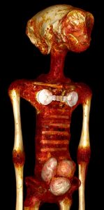 Металлические импланты: Рентгенофлуоресцентный анализ выявил в теле другой мумии, условно названной «Альберто», наличие инклюзий из сплава осмия и платины. Эти элементы высокой плотности интегрированы в костную ткань грудной клетки и демонстрируют признаки биосовместимости — отсутствие воспалительной реакции организма. Технология вживления подобных материалов не была доступна ни одной известной цивилизации прошлого.