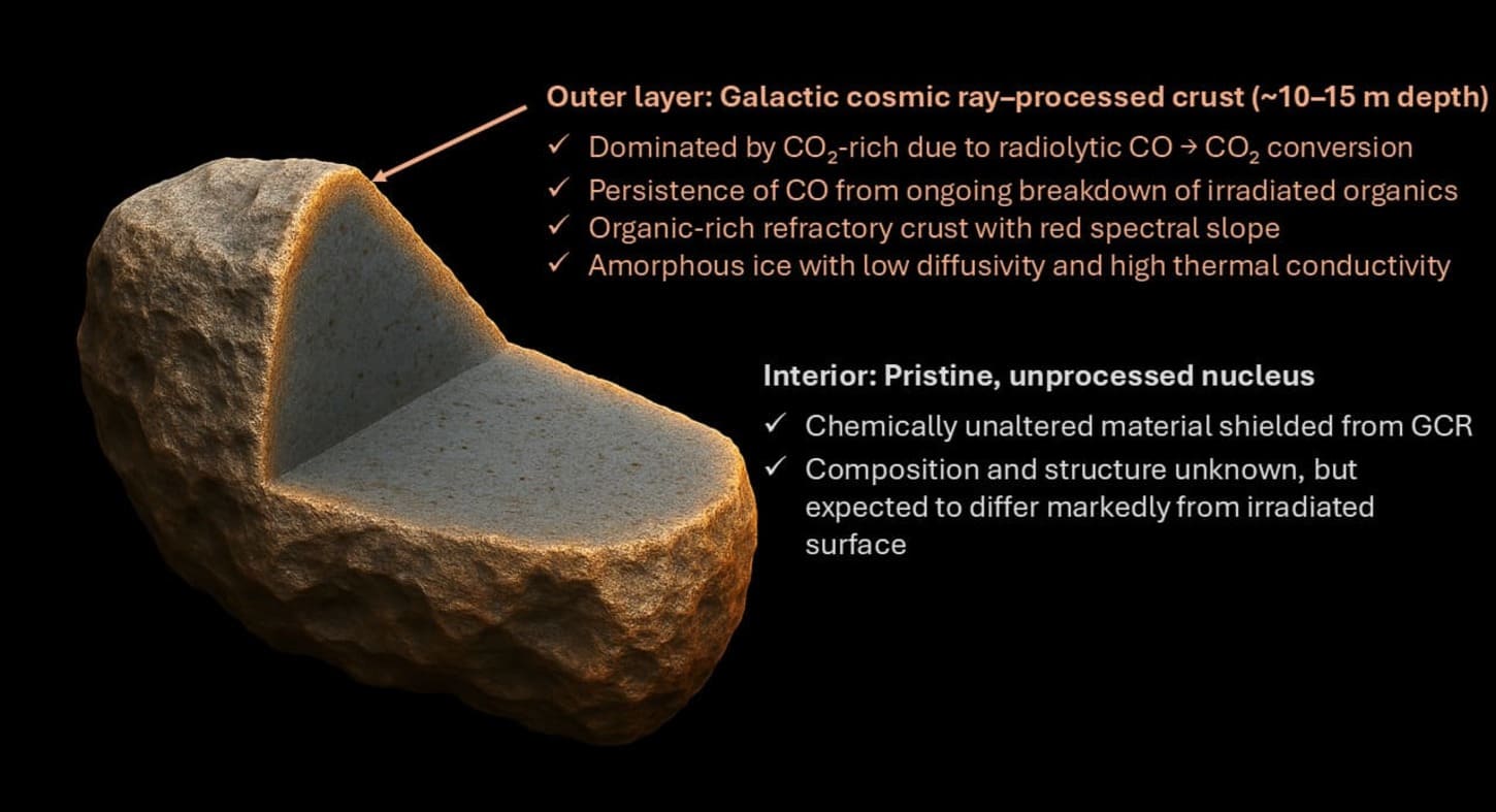 Предполагаемый поверхностный слой вещества 3I/ATLAS, измененного галактическим излучением.