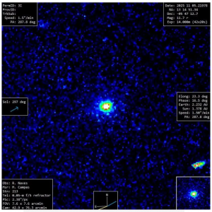 Постперигелия изображение межзвездного объекта 3I/ATLAS, сделанное 5 ноября 2025 года R. Обсерватория Нефов, показывает нечеткий шар света. Солнечное направление направлено в сторону нижнего левого угла (с стрелкой слева, указывающей на антисолнечное направление). Никакого очевидного кометного хвоста замечено не было. (Фото: R. Обсерватория Нефов, Испания)