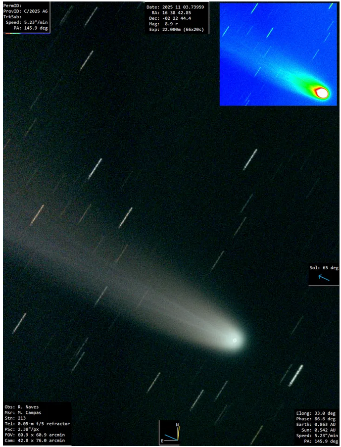 Изображение кометы Леммон из Солнечной системы, сделанное 3 ноября 2025 года R. Обсерватория Нефов показывает чистый кометный хвост от Солнца. (Фото: R. Обсерватория Нефов, Испания)