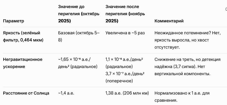 Яркость и цвет: Перед перигелием объект посветлел в 5 раз и стал «синим» (более короткие волны, чем у Солнца). Это может быть от CO⁺-эмиссии (газ) или «горячего двигателя».