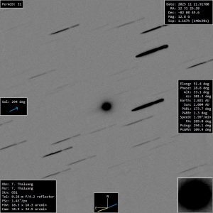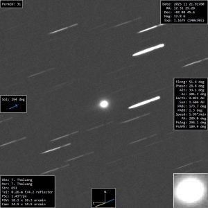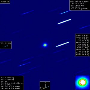 22.11.2025 г. Сегодня в сети появился новый снимок сделанный 21 ноября 2025 года тайским астрономом-любителем Teerasak Thaluang (обсерватория MPC O51, Районг, Таиланд) с помощью 0,26-метрового телескопа (10-дюймовый рефлектор). Это одно из самых детальных любительских изображений кометы на сегодняшний день. Teerasak Thaluang обработал изображение разными методами, давайте его рассмотрим.