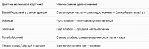 Короче: разноцветные кольца — это просто красивая «карта яркости», чтобы глазам было понятнее, где что светится сильнее или слабее. Настоящий цвет кометы — белый с лёгким зеленоватым оттенком (из-за газов), а не радуга.