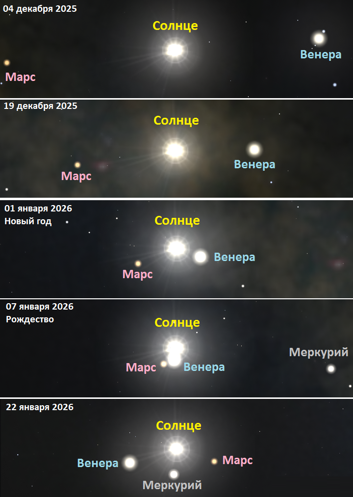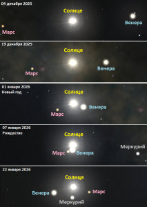 Соединение Венеры, Марса и Меркурия с Солнцем в декабря 2025 — январе 2026 года.