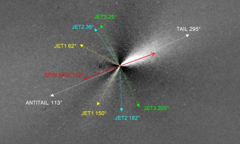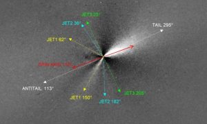 Более детальный анализ внутренней комы с применением специальных фильтров (1/r и Ларсона-Секанина) выявил наличие шести слабых прямых струй (джетов), истекающих из ядра кометы. Эти струи теряют свою чёткую форму уже на расстоянии нескольких тысяч километров из-за рассеяния пыли. Учёные установили, что струи образуют три симметричные пары относительно предполагаемой оси вращения ядра. Каждая такая пара, вероятно, представляет собой два края конуса выброса вещества из активной области на вращающейся поверхности ядра.
