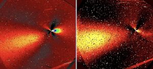 Солнечная струя, длина которой в десять раз превышает ее ширину, уже была зафиксирована «Хабблом» 21 июля. Она зародилась вблизи освещенного Солнцем полюса задолго до перигелия, при прохождении его отклонялась слабо. Если предположить, что ориентация оси вращения кометы не менялась, теперь ее «бывший дневной бок», наоборот, направлен в противоположную от светила сторону — туда же, куда и более слабая струя на новых снимках.