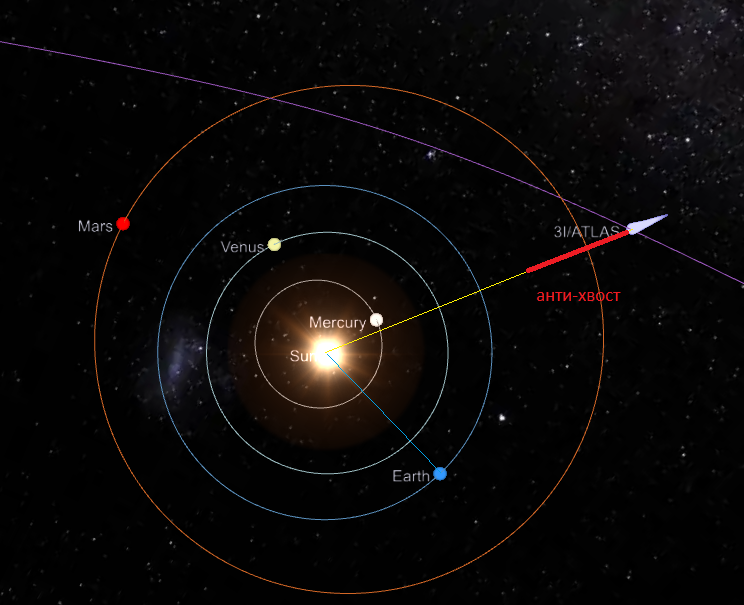 После перигелия траектория развернулась на ~16 градусов из-за гравитационного маневра у Солнца, и объект начал удаляться. Однако антихвост не перевернулся: он остался направленным к Солнцу, теперь против направления движения. Это как если бы ракета, развернувшись, продолжала тормозить «назад», а не ускоряться вперед.