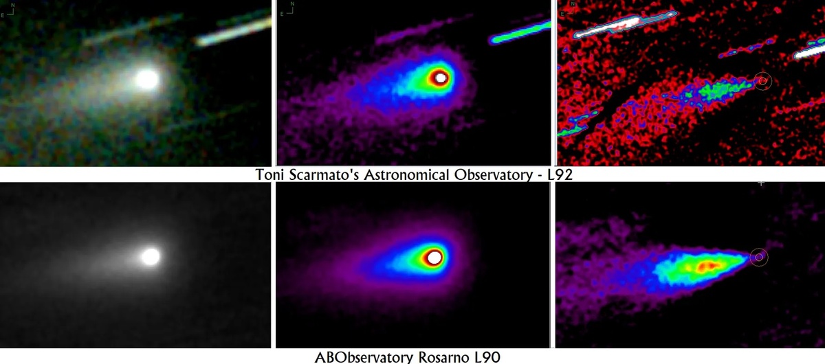 Изображения 3I/ATLAS от 13 января 2026 года в трех форматах: карта яркости в оттенках серого (слева), псевдоцвета (средний ряд) и обработка с помощью вращательного градиентного фильтра Ларсона-Секанины, который удаляет кругово-симметричное свечение (справа). Отфильтрованные изображения справа показывают заметный антихвостовой поток в направлении Солнца в левом нижнем углу.T. Scarmato and A. Brosio