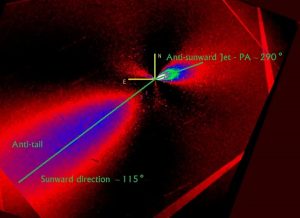 Изображения, охватывающие область в 300 000 километров, показали, что карты яркости пыли и органических веществ имеют грушевидную форму с удлинением «антихвоста» в сторону Солнца. При этом остальные шесть газовых шлейфов сохраняют почти круглую форму.