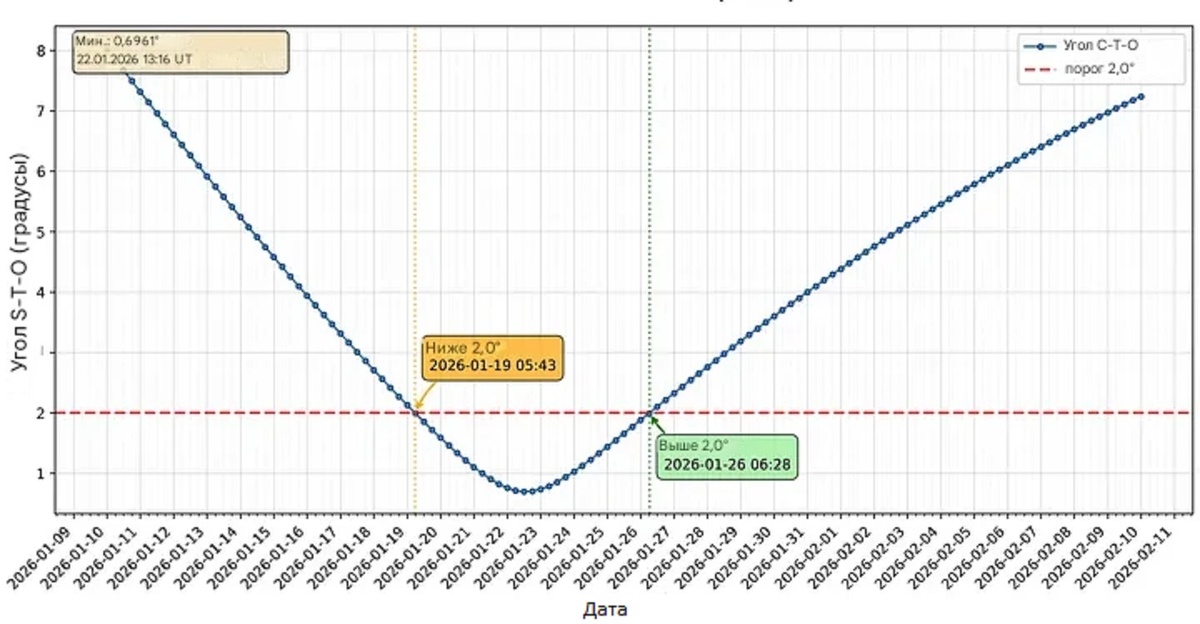 А вот 3I/ATLAS, открытая в июле 2025 года системой ATLAS, летит так, что 22 января 2026 года угол между линией Солнце–Земля и Солнце–комета составит всего 0,69°! Причём угол меньше 2° будет держаться целую неделю (примерно 19–26 января).