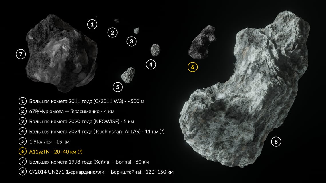 Астрономы пока не могут точно измерить размер кометы A11yzTN, но ее яркость на столь огромном расстоянии указывает на то, что ядро может быть очень большим – возможно, около 20–40 километров в поперечнике, что примерно соответствует ширине крупного города. Для сравнения, комета 67P/Чурюмова-Герасименко – первая комета, на которую совершил посадку космический аппарат – имеет ядро шириной около 4 км. Комета C/1995 O1 (Хейла-Боппа) – одна из самых впечатляющих комет, видимых невооруженным глазом, в конце XX века – по оценкам, имела ядро около 60 км в поперечнике. Самое большое из известных кометных ядер принадлежит C/2014 UN271 (Бернардинелли-Бернштейна), его размер оценивается примерно в 120-150 км в поперечнике (этот гигант достигнет перигелия только в январе 2031 года и останется на расстоянии около 10,95 а.е. от Солнца – слишком далеко, чтобы стать яркой кометой, которых обычно ждут наблюдатели). Одним словом, A11yzTN, возможно, и не рекордсмен по размеру – но она все равно может оказаться довольно крупной кометой.