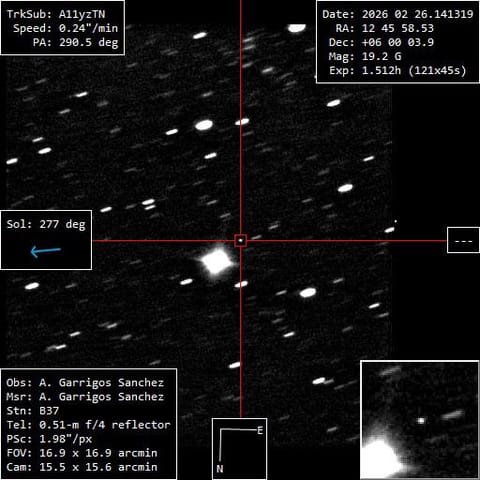 Один из первых известных снимков кометы A11yzTN, сделанный 26 февраля 2026 года. На этом раннем кадре с телескопа объект выглядит как тусклая, похожая на звезду точка на фоне неба, пока еще без заметной большой комы.