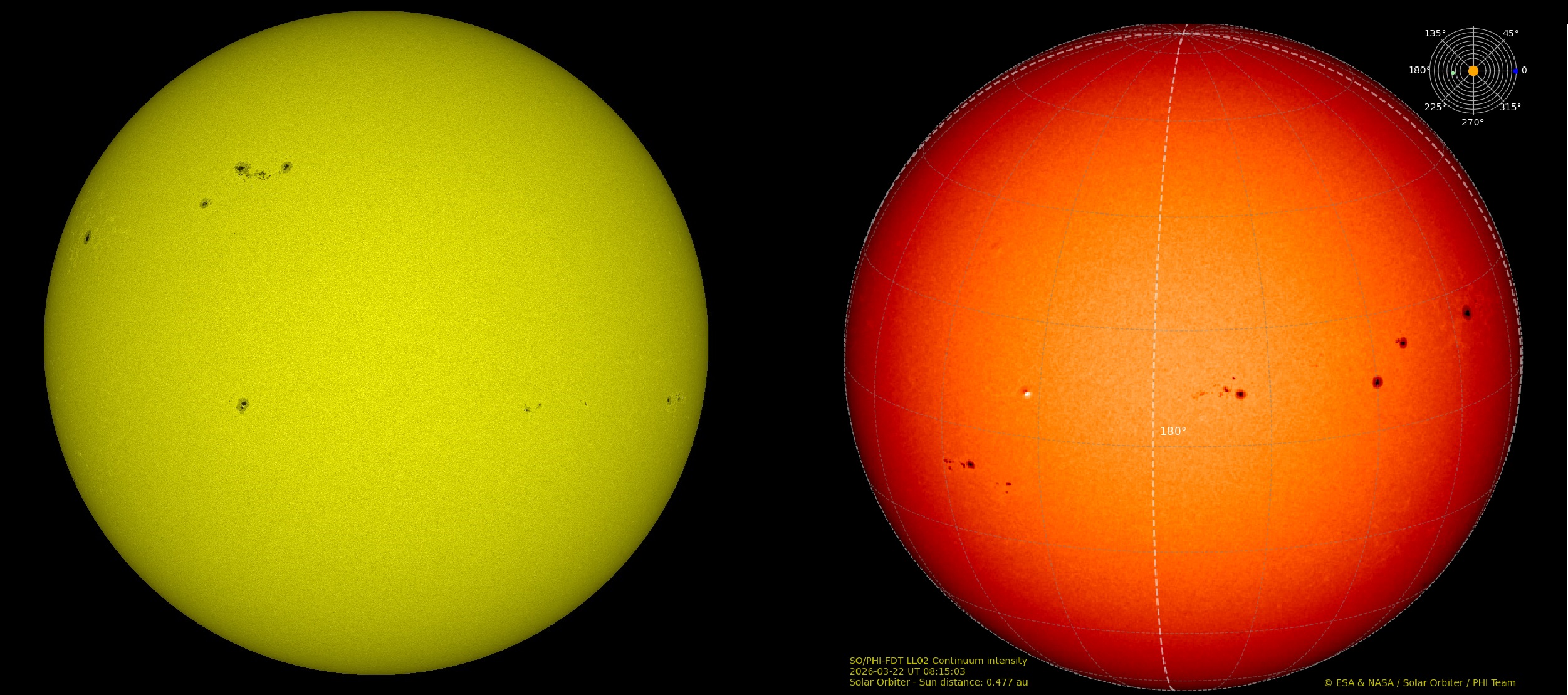 На снимках: слева— Солнце, видимое от Земли (телескоп HMI на SDO), справа— обратная сторона Солнца, видимая Solar Orbiter (прибор PHI).