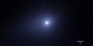 На изображении межзвездная комета 3I/ATLAS: яркая точка в центре — ядро, а размытое голубоватое облако вокруг — кома из газа и пыли, испаряющихся под нагревом Солнца. Цвета ложные и получены путем объединения трех диапазонов цвета, чтобы лучше показать структуру вещества. / © NAOJ