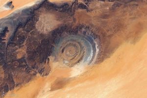 Но самая поразительная деталь, заметная сверху, — это структура Ришат: огромная геологическая формация из концентрических гряд на восточной окраине плато. Французские географы впервые описали ее в 1930-х годах, назвав «пуговичным отверстием Ришат». Астронавты Эд Уайт и Джеймс Макдивитт привлекли к ней внимание всего мира, запечатлев ее во время своей исторической миссии Gemini IV, после чего объект получил прозвище «Глаз Сахары».
